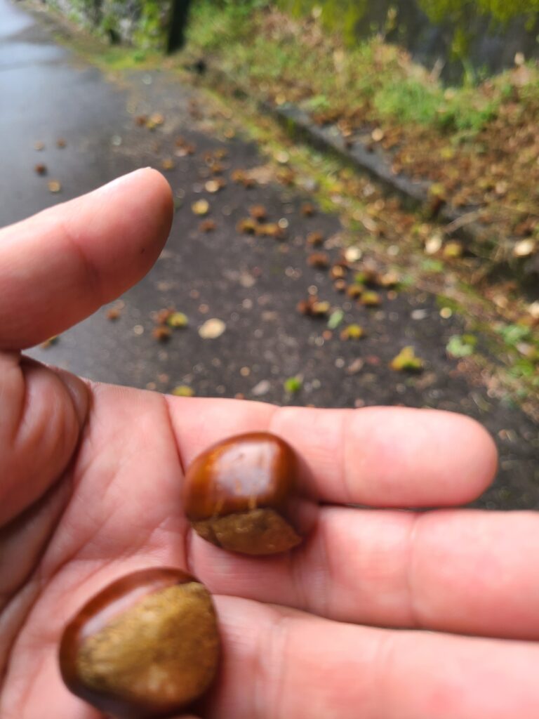 昼休みのジョギング中に、道路沿いの山から猿が栗(山栗)を投げつけてきました。