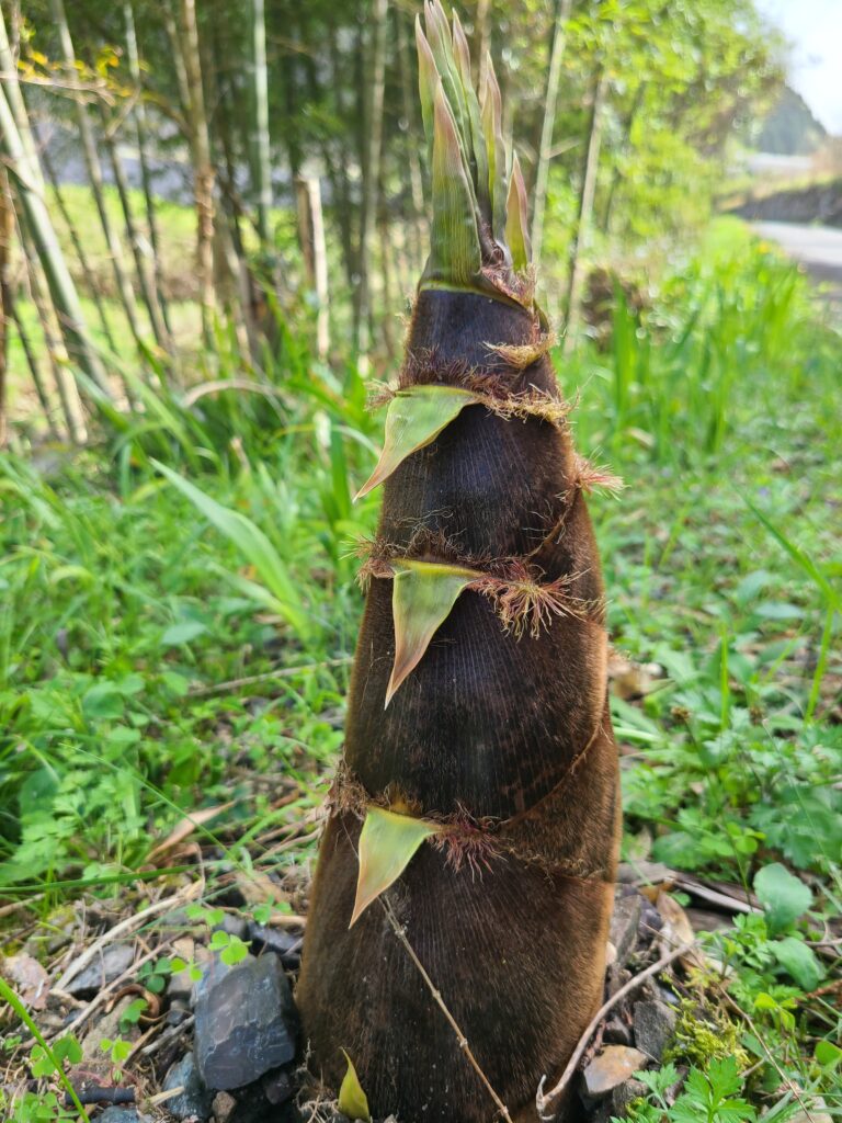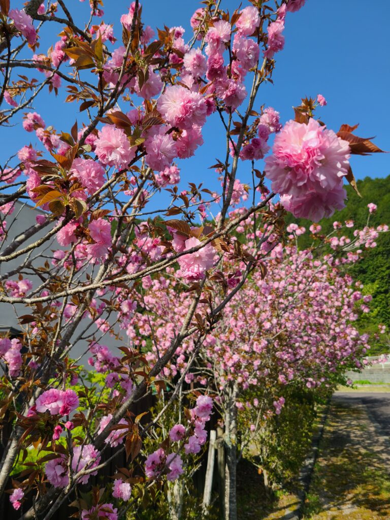 左は道端のタケノコ、右は老健の駐車場の3本の里桜(八重桜)。春爛漫ですが、昼間はもう夏日。
