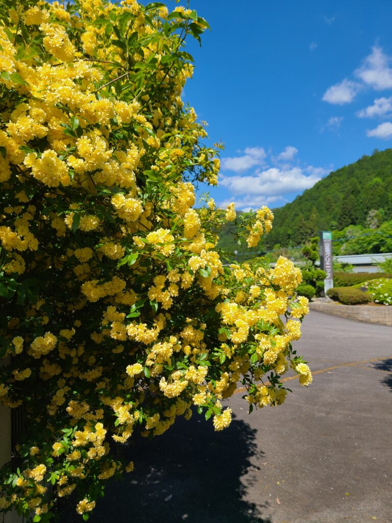 クリニック周辺のモッコウバラとつつじが満開です。そうそうモッコウは「木瓜」で八坂神社の社紋や織田信長の軍紋の『木瓜紋』のモッコウです。
