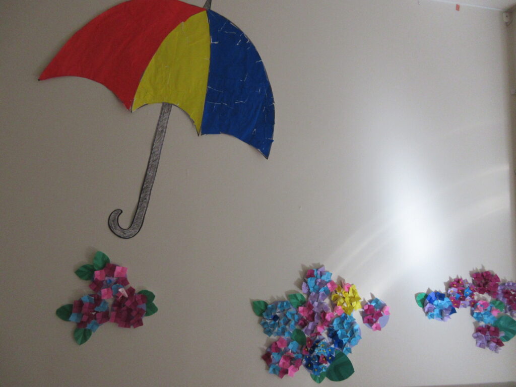 傘と紫陽花です。ちょうど紫陽花に光が虹のようにあたっています
