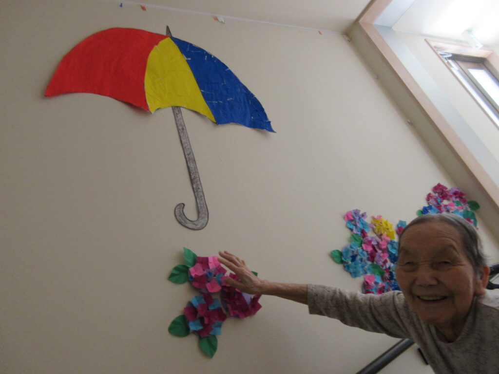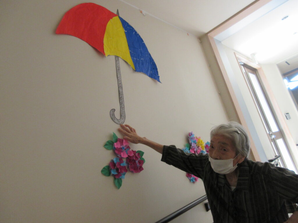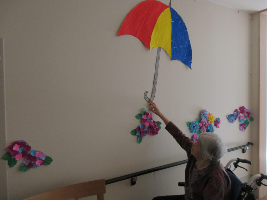 いつでもカメラを向けると素敵な笑顔をみせてくださいます。普段から手を高くあげることが減っていますが、傘を触るため手を伸ばすといういいリハビリになっています。