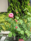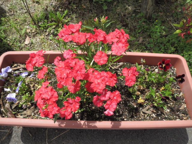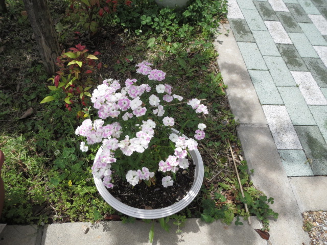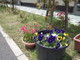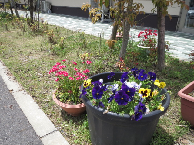 穂の周りには鉢植えの可愛らしい花々が咲いています。