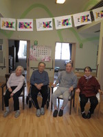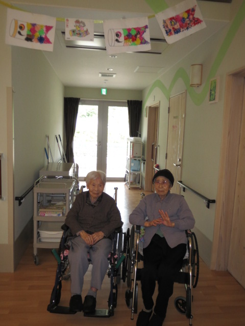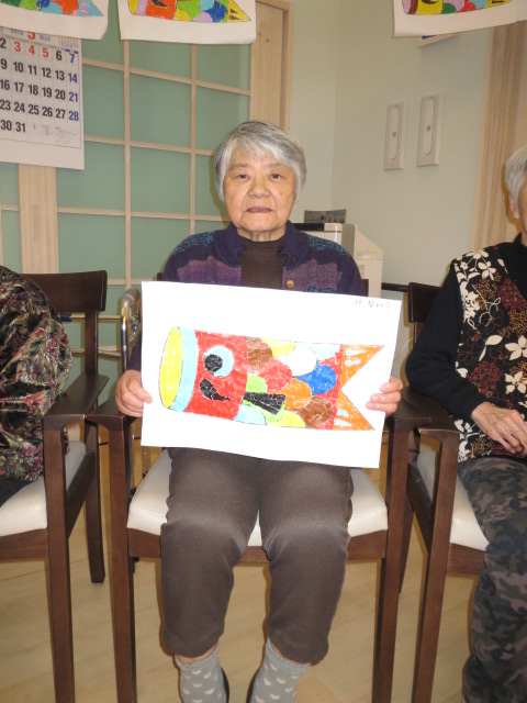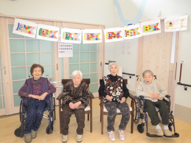 5/5のこどもの日に向けてご利用者様が各ユニットで様々な方法で飾りつけをしたこいのぼりを作成されました。