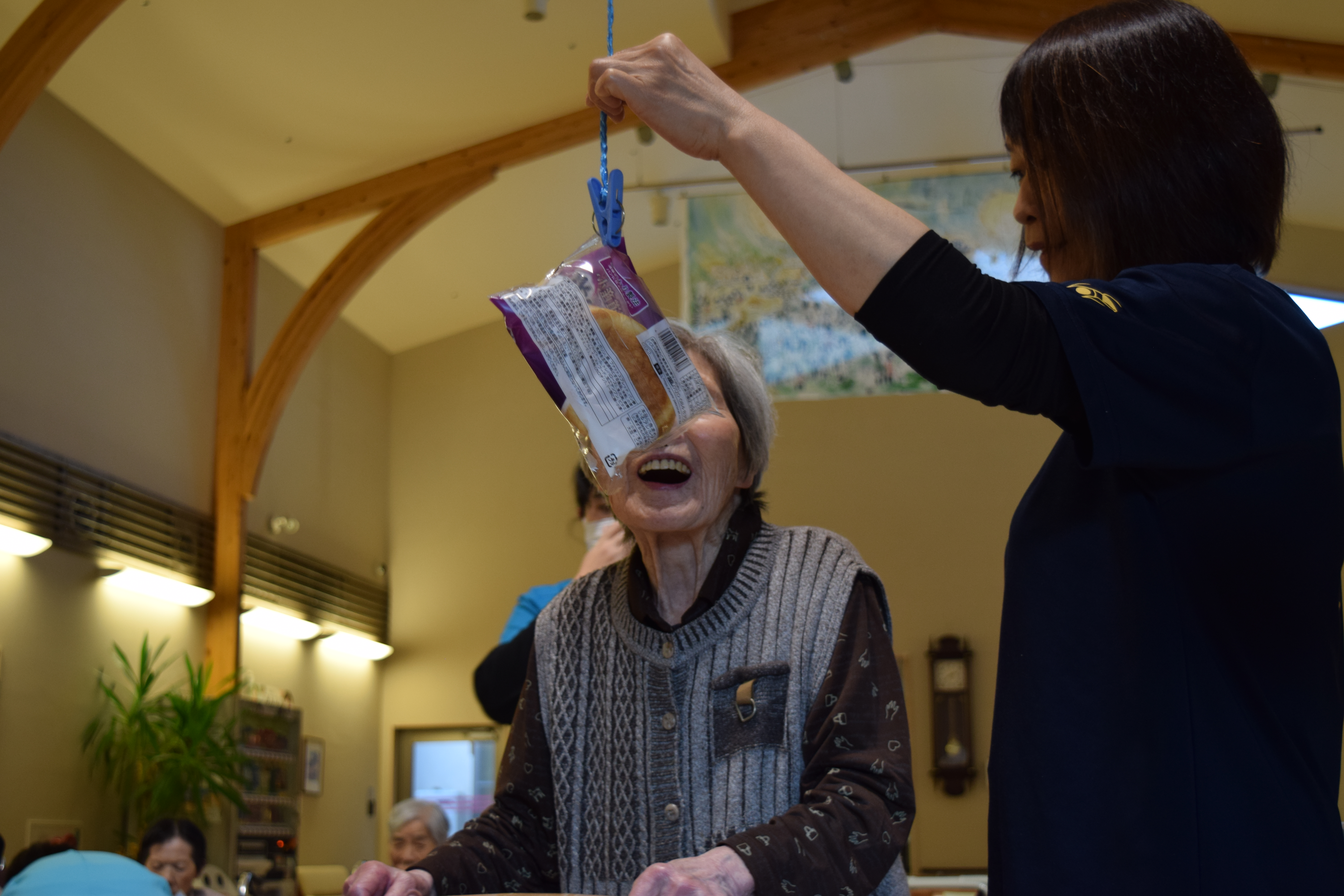 パン食い競争は、普段あまり手を上に上げることのないご利用者様も一生けんめい手を伸ばして、パンを取っていらっしゃいました。