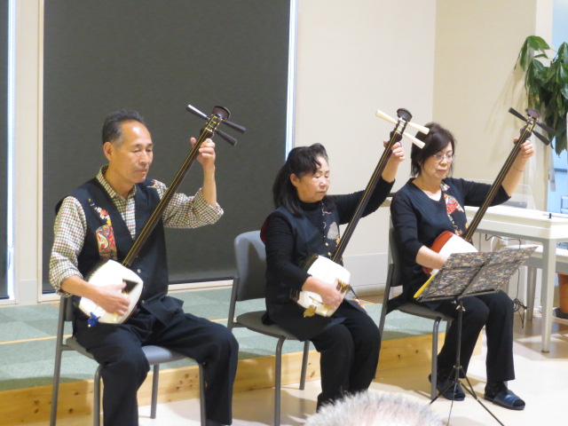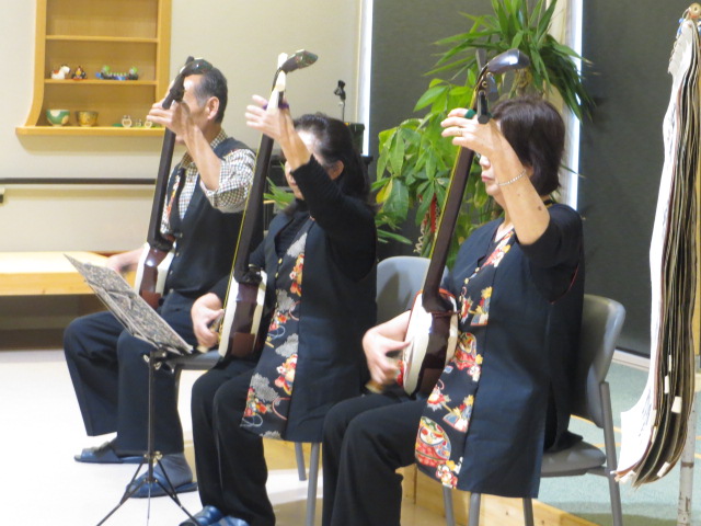 前回お越しいただいたときに弦が切れてしまい、それでも仕切りなおしてとても素敵な音色を響かせていただいたのですが、その時のリベンジに今回は、素敵なおそろいの衣装に身を包み、3人の演者が来てくださいました。