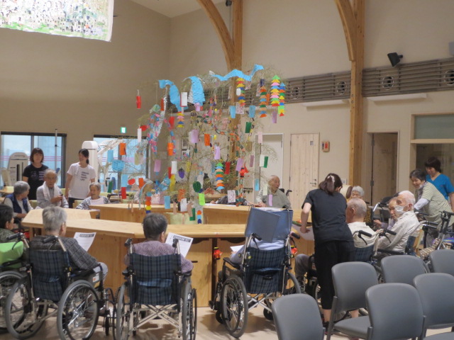 皆さんの願い事がたくさん飾られた笹飾りを囲んで、穂に入所の皆さんで七夕会を開催しました。