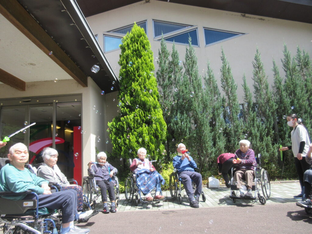とてもいい気候のこの季節に、日光浴をしながら手の運動にもなり、童心にも帰ることのできるシャボン玉をご利用者様と一緒に楽しみました。
