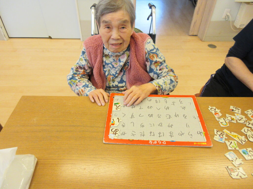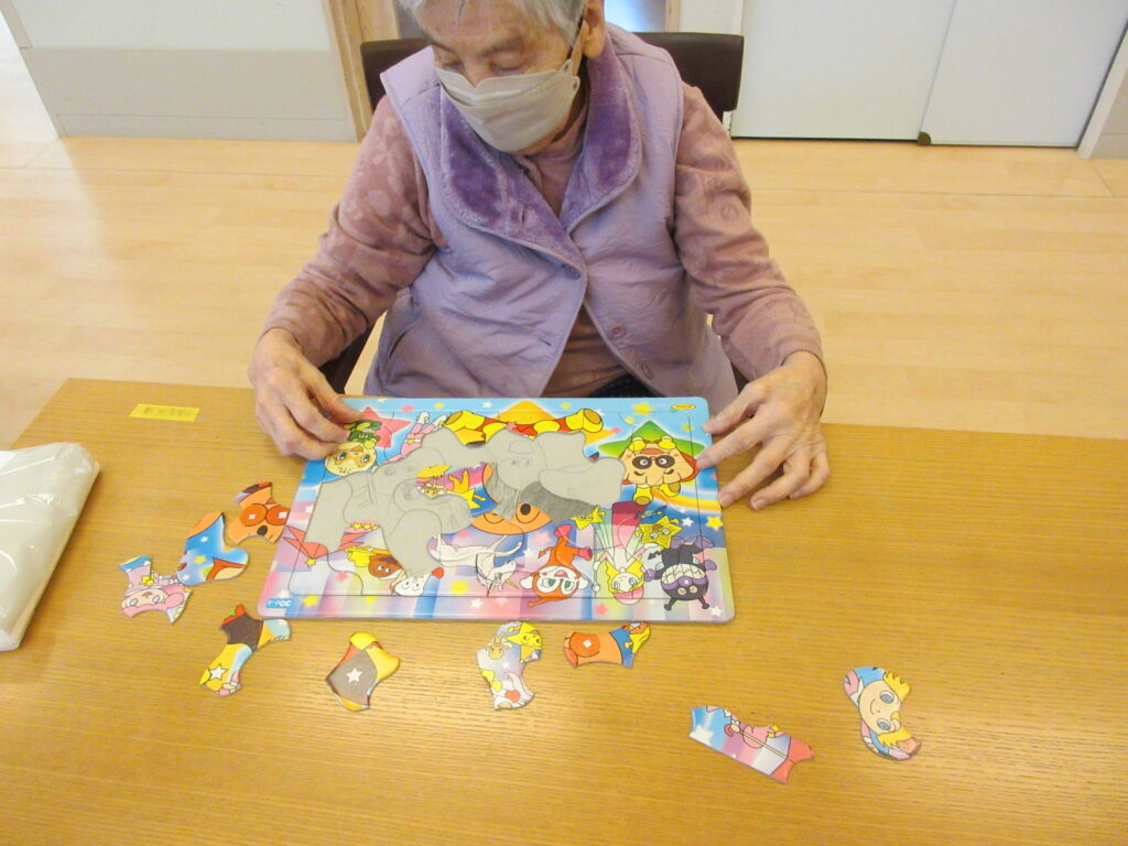 大人だから簡単にできるというものではなく、また、頭も使います。疲れますが、何かやりたいと皆さん頑張られます。二人で協力してパズルを完成させられる方もみえます。